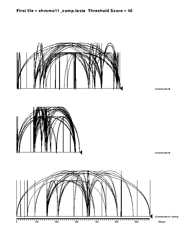 Most DNA analysis programs could not cope with either reading or sensibly displaying entire yeast chromosomes of over 600 Kbase length but Miropeats does it quite easily. It takes about 4 minutes on a 40MHz SPARCStation to examine yeast chromosome 8 (570 Kbases) looking for all its internal repeats. To see an example showing three separate chromosomes on a single diagram, click on PostScript version or GIF version. By switching off repeats between sequences it is possible to see the repeats within the three chromosomes more clearly. The telomeres are obvious as inverted repeats in all the chromosomes, the mating locus is the main feature in the centre of Chromosome3 and two duplications are shown next to each other in Chromosome 8. Also of interest is the striking overall similarity of each of the chromosome's repeat patterns.