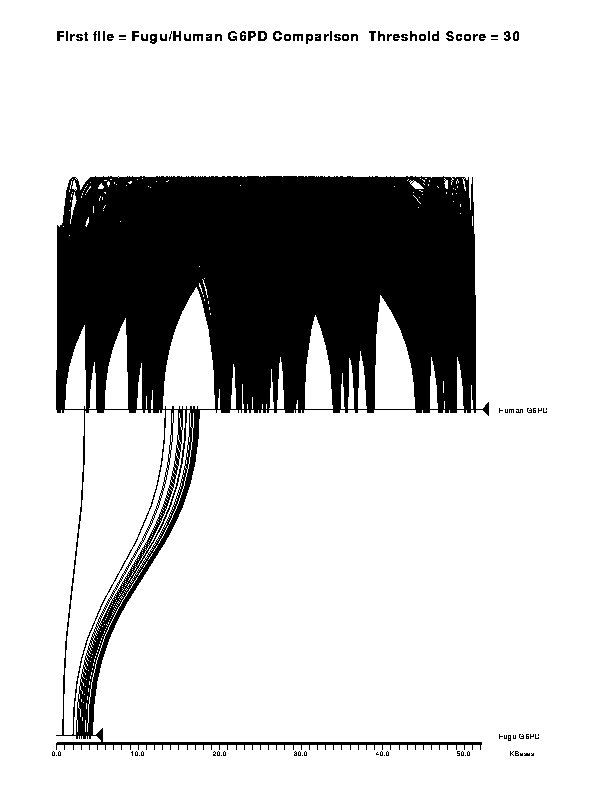 To see a comparison between two instances of a homologous gene, one from Fugu rubripes and the other in the human, as performed by Miropeats then click onPostScript version or GIF version. The large number of repeats drawn above the human sequence are mostly Alu repeats which are abviously absent from the Fugu fish homologue. The 11 pairs of lines that join the two G6PD sequences correspond to the 11 exons that are found in both examples of this gene.