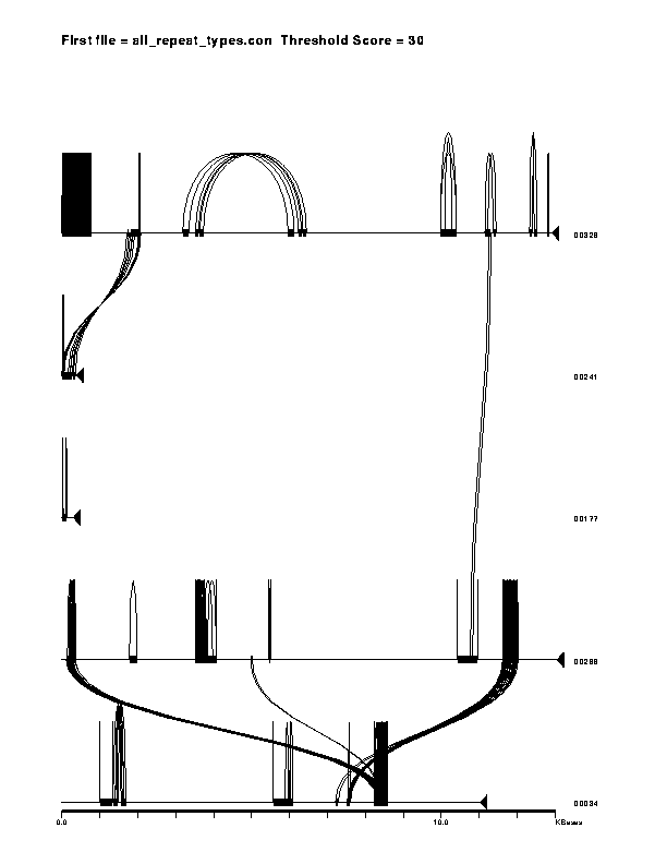 To see an example of what a relatively complex C. elegans sequence assembly project can look like when some initial "finishing" work has been done click on PostScript version or GIF version. Many features are represented including examples of each of the different types of DNA repeats distinguishable using Miropeats: tandem, inverted, tandem oligo, and palindrome. The graphic also shows that contig number "00241" is probably just a subsequence of "00328" that has not yet been integrated into a single contig. Please note that the programs have no divine knowledge and cannot distinguish between biological duplication events and assembly mistakes - that is for you to decide.